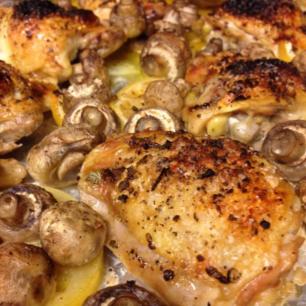 Hot Oven Roasted Chicken Thighs later Chicken Thighs, Mushrooms, Lemon, Olive Oil, Kosher Salt, Black Pepper